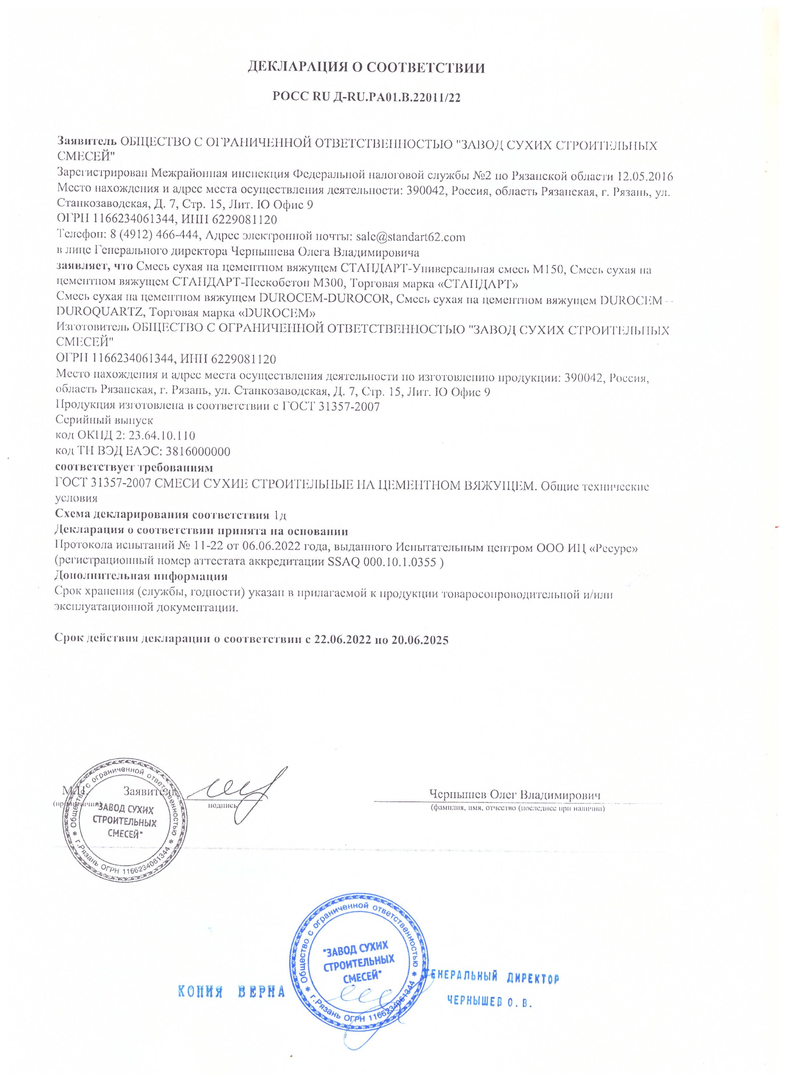 Смесь сухая на цементном вяжущем. РОСС RU Д-RU.РА01.В.22011/22
